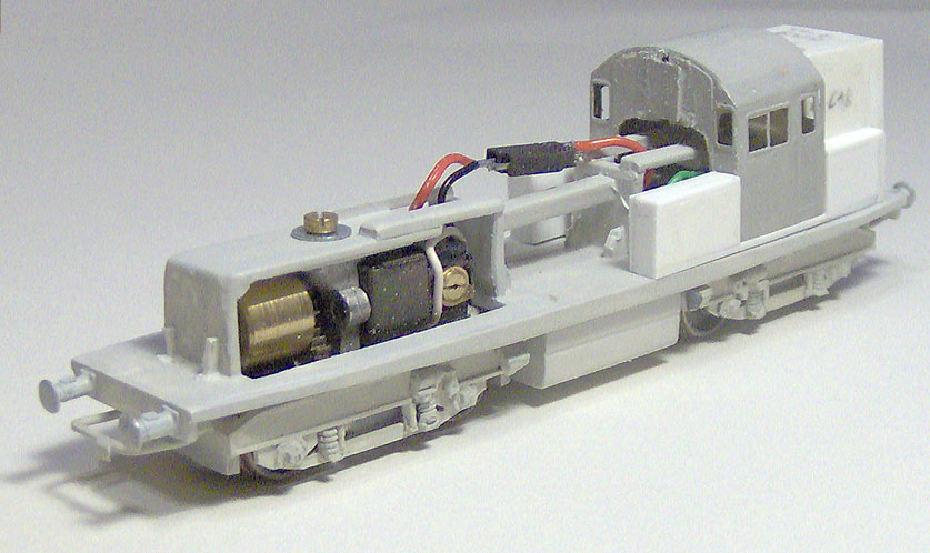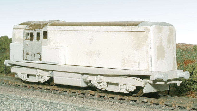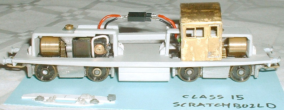 9. The chassis is now fully running and weighted with lead in the central fuel tank. Simple bar couplings made from brass wire have been soldered to the whitemetal bogies and 3mm Society whitemetal BR standard loco buffers fitted. The Chinery bogies are continuously wired with a plug and socket and it pulls a respectable number of wagons and runs smoothly through reverse curve pointwork. There'd even be room in the middle for a DCC decoder (hmmm...). Only one sideframe has been half-completed so far though, they really are a very tedious job.